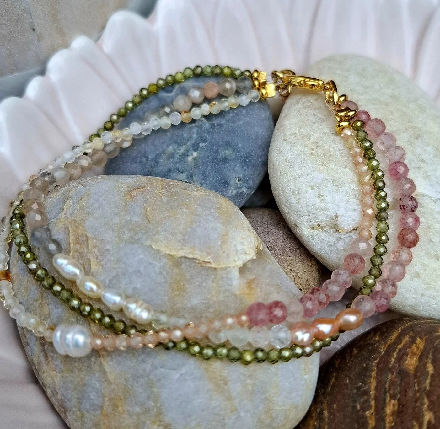 The Jacqueline bracelet features three strands of freshwater pearls and gemstones mixed in the most stunning colour combinations. Threaded onto a single clasp for a simple yet beautiful stacked bracelet look. Inspired by Australian nature, where the beauty of the desert, beach and forest can all intertwine.