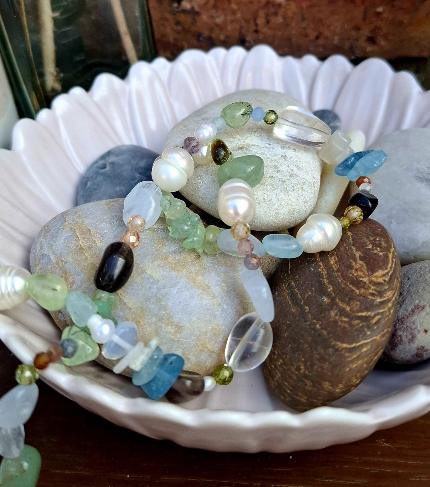 Whilst the gemstones, pearls, glass and nylon line are water friendly, nearly all my items contain alloy crimps and plated copper or brass. I do not recommend wearing any of my pieces in water to ensure they remain as new for as long as possible. Please read my care instructions thoroughly.